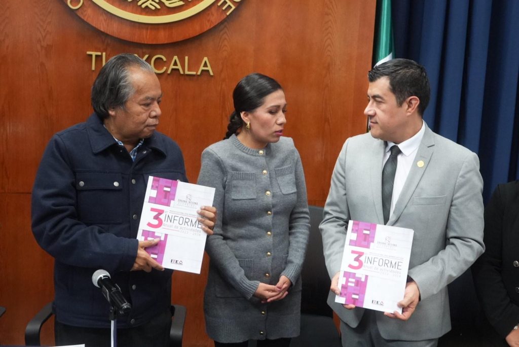 La Comisión de Asuntos Electorales del Congreso del Estado, presidida por el diputado Silvano Garay Ulloa, recibió el Tercer Informe de Actividades del órgano Interno de Control del Instituto Tlaxcalteca de Elecciones (ITE). El documento fue entregado ante la presencia del presidente del ITE, Emmanuel Ávila González en el Salón Rojo del Palacio Legislativo por la titular del Órgano Interno de Control, Johancy Aquiáhuatl Denicia, quien detalló las acciones realizadas y el gasto ejercido durante el tercer año de gestión.