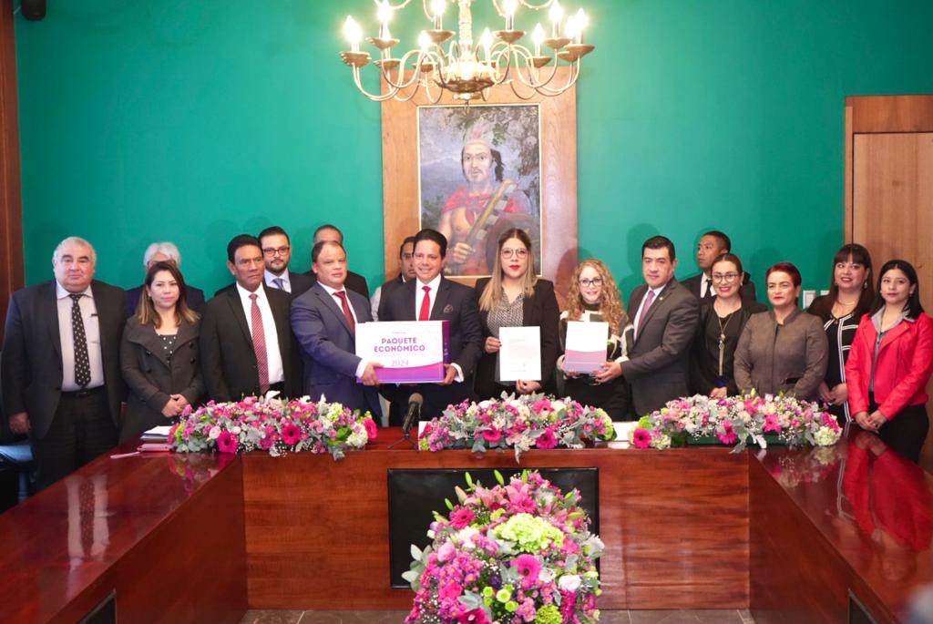En el Salón Verde del Recinto Legislativo, las diputadas Mónica Sánchez Angulo y Marcela González Castillo, presidentas de la Mesa Directiva y de la Junta de Coordinación y Concertación Política, respectivamente, en compañía del diputado Ever Alejandro Campech Avelar en su calidad de presidente de la Comisión de Finanzas y Fiscalización, así como las diputadas Reyna Flor Baéz Lozano, Fátima Guadalupe Pérez Vargas, María Guillermina Loaiza Cortero y Gabriela Esperanza Brito Jiménez recibieron el Paquete Económico del Estado de Tlaxcala para el Ejercicio Fiscal 2024.