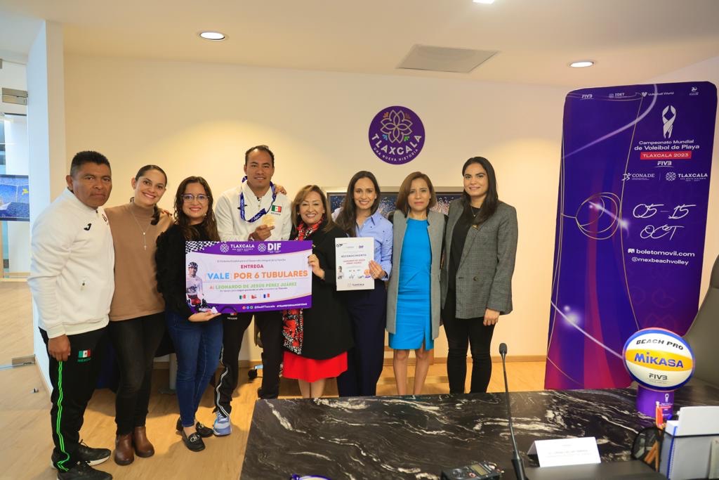 Asimismo, estuvieron la presidenta honorífica del Comité Consultivo de Bienestar y Desarrollo Social del Estado de Tlaxcala, María Fernanda Espinosa de los Monteros Cuéllar y la directora María Estela Álvarez Corona; así como la presidenta honorífica del Sistema Estatal para el Desarrollo Integral de la Familia (Sedif), Mariana Espinosa de los Monteros Cuéllar; la directora general del Sedif, Flor López Hinojosa, quienes entregaron un reconocimiento y un vale por seis tubulares para continuar con su preparación física.