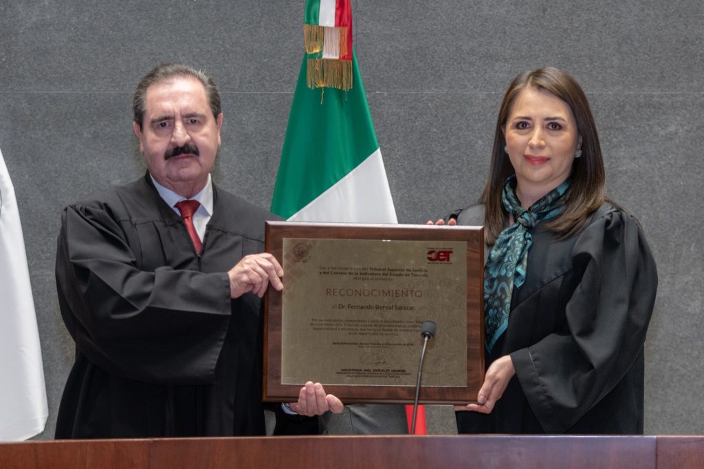 Este día los integrantes del pleno del Tribunal Superior de Justicia en el Estado (TSJE), reconocieron al magistrado Fernando Bernal Salazar, por sus 24 años de trayectoria dentro del Poder Judicial de Tlaxcala, quien el próximo 23 de octubre culminará el segundo periodo para el que fue electo como magistrado propietario, tiempo durante el cual, se condujo con dedicación, compromiso y profesionalismo, motivo por el cual, le fue otorgado también el carácter de Magistrado en Retiro, a partir de que concluya su encargo.
