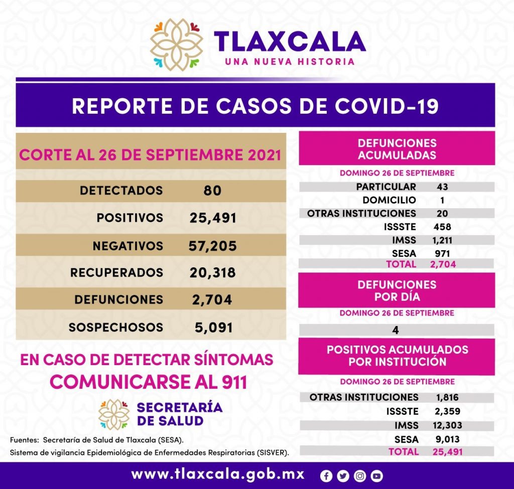 Los datos de la SESA registrados en la plataforma nacional del Sistema de Vigilancia Epidemiológica de Enfermedades Respiratorias (SISVER), confirmaron 80 casos positivos de Covid-19 y cuatro defunciones el domingo 26 de septiembre de 2021.