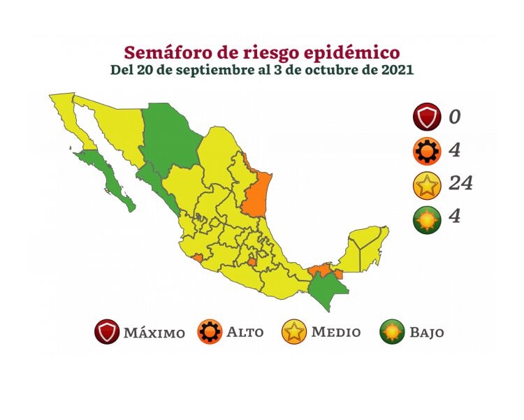 Este viernes 17 de septiembre la dependencia federal informó la modificación correspondiente del semáforo epidemiológico de Covid-19 en el país, en el cual ningún estado se encuentra en color rojo, que representa el riesgo máximo de posibles contagios.