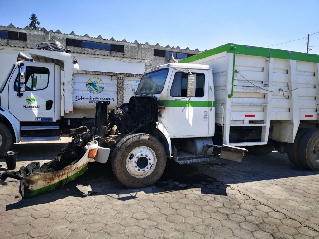 Elementos de la Coordinación de Protección Civil de Huamantla, con el apoyo de trabajadores de la Dirección de Servicios Públicos municipales, sofocaron un incendio en una unidad de recolección de basura.