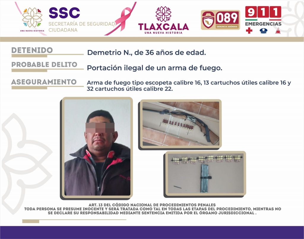 La Secretaría de Seguridad Ciudadana (SSC) de Tlaxcala mediante acciones enfocadas a la prevención y combate al delito, detuvo este fin de semana en el municipio de Huamantla a una persona por la portación ilegal de un arma de fuego.