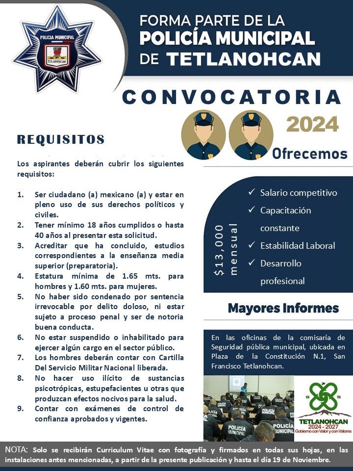 A partir de este seis y hasta el 19 de noviembre la Comisaría de Seguridad Pública Municipal estará recibiendo solicitudes de mujeres y hombres de entre 18 y 40 años que cumplan con los requisitos establecidos en la convocatoria, la cual ya fue publicada en la página Facebook del Ayuntamiento de Tetlanohcan.