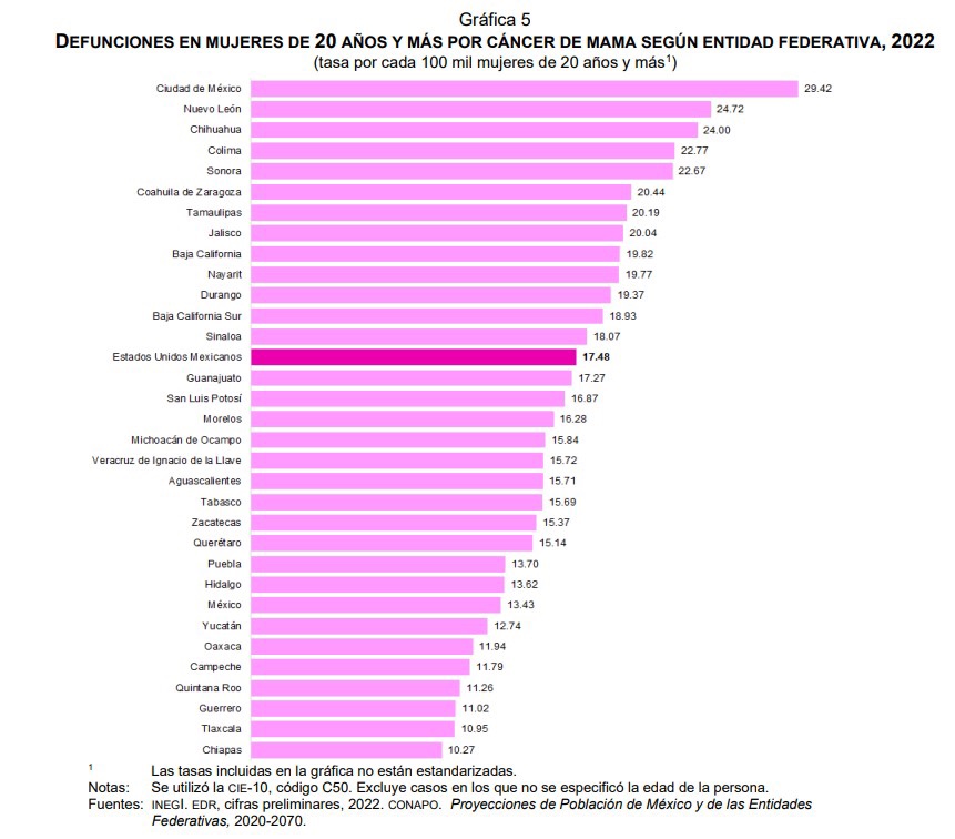 *De acuerdo con el Inegi, presenta una tasa de 10.95 defunciones por cada 100 mil mujeres, que es menor a la media nacional de 17.48