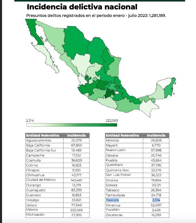 Con base en datos del Secretariado Ejecutivo del Sistema Nacional de Seguridad Pública (Sesnsp), Tlaxcala se ubica como la entidad más segura del país al registrar la menor incidencia delictiva acumulada en 2023, pues de enero a julio se han reportado 2 mil 314 denuncias.