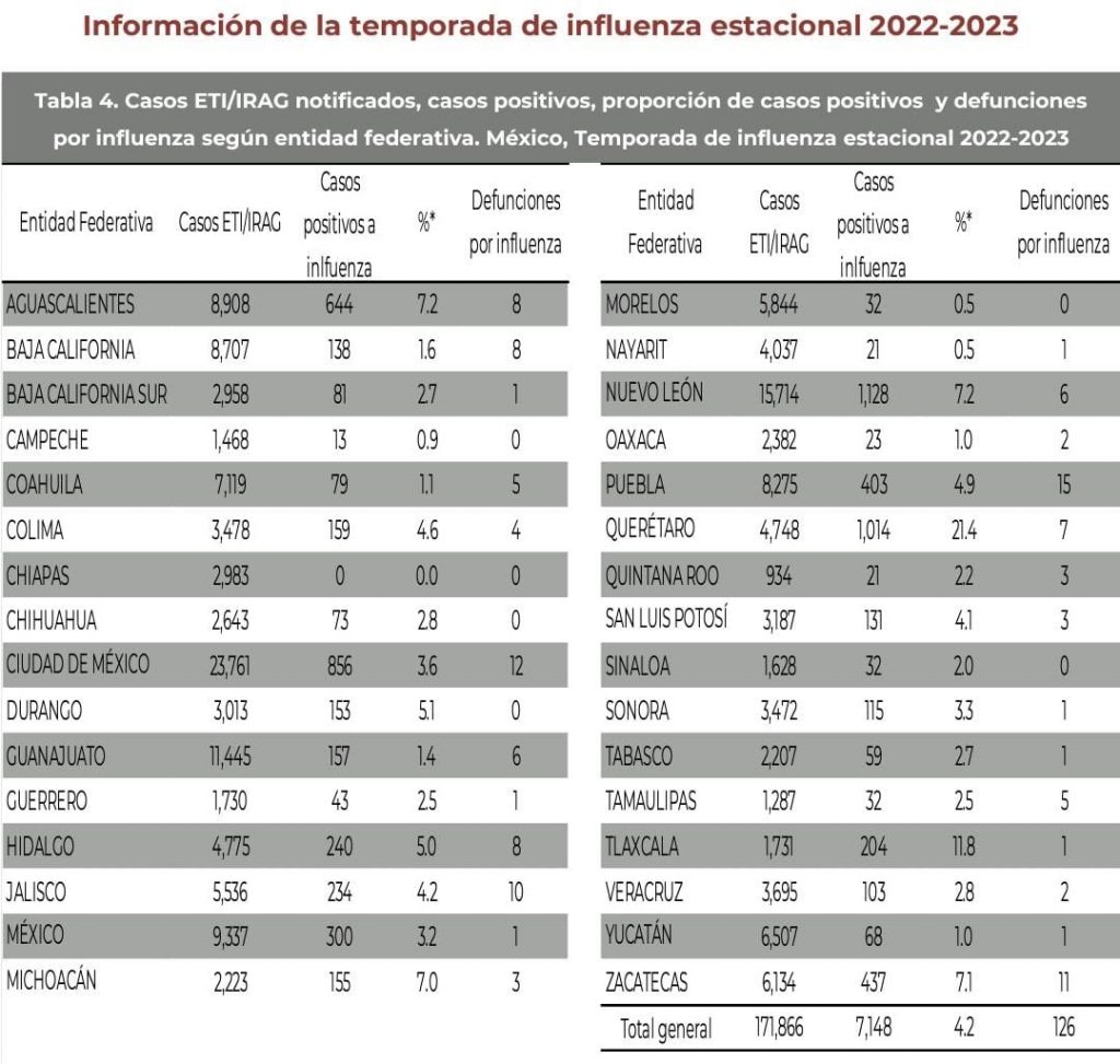 El mismo documento, señala que a nivel nacional se sumaron 126 defunciones por dicha enfermedad, Puebla fue el estado que presentó la mayor cantidad con 15 fallecimientos, seguido por la CDMX con 12, Zacatecas con 11 y Jalisco con 10. En tanto, Tlaxcala se mantuvo con una defunción.