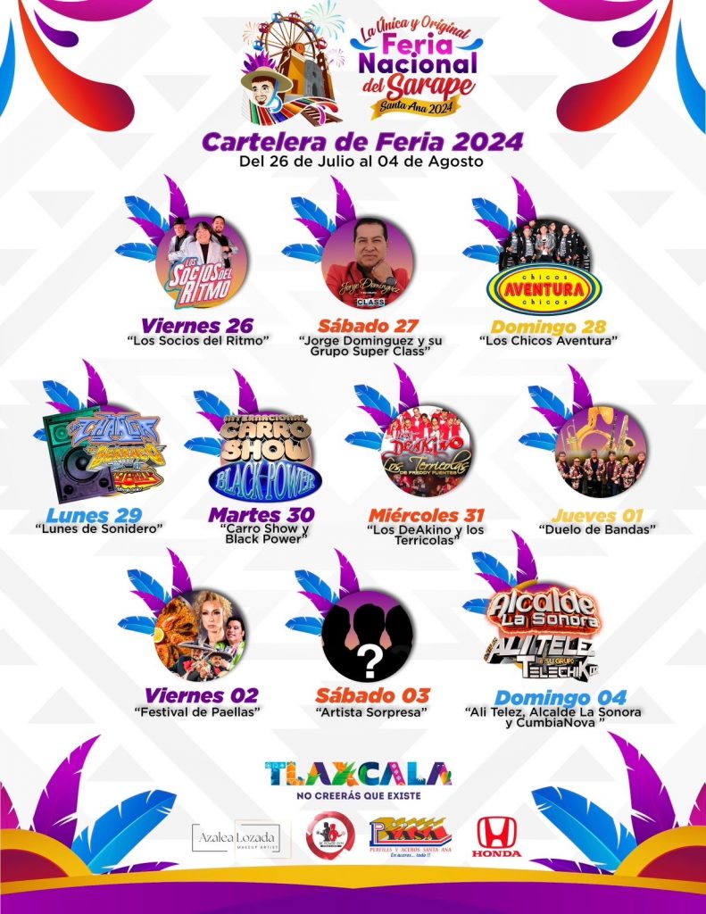 Con un excelente ambiente familiar y un foro artístico llamativo, el Ayuntamiento de Chiautempan y el Patronato de Feria te invitan a “La Única y Original Feria Nacional del Sarape Santa Ana 2024”, del 26 de julio al 04 de agosto.