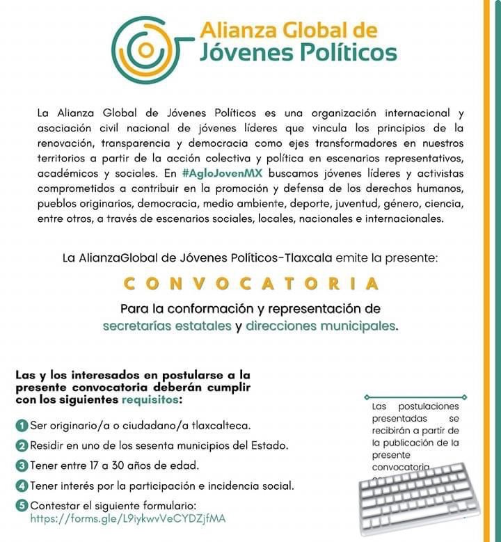 Desde Aglo Joven Tlaxcala se convoca a todas las juventudes tlaxcaltecas de entre 17 a 30 años, que se encuentren interesados en formar parte de la organización y desempeñarse como voluntarias y voluntarios, para promover la participación de las juventudes a nivel municipal, estatal y nacional.